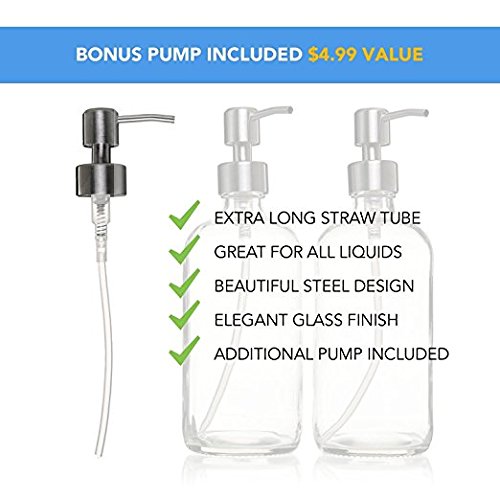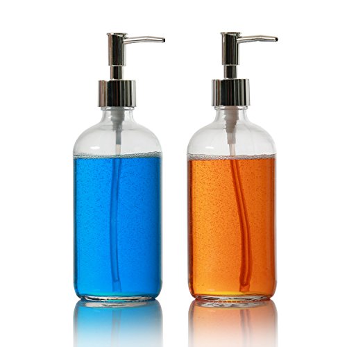 2 Pack, 16 oz. Liquid Soap Dispenser with Polished Pump, BONUS PUMP included, Refillable Round Clear Glass Bottle, Perfect for Liquid Soap, Essential Oils and Lotions, By California Home Goods