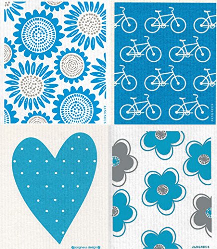 Swedish Dishcloth - Set (TU) of 4 Turquoise Sunflowers, Daisies, Heart, Bikes