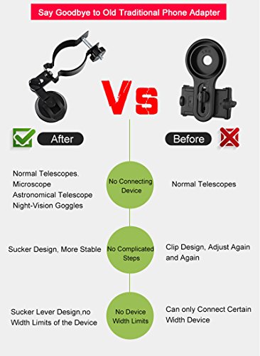 Note: Please make sure that the outer diameter of the eyepiece is between 37mm-49mm (1.46"-1.93") Tips: 1.Take off the phone case before connecting. 2.Make sure the back surface of the phone is smooth before connecting. 3.If the phone is small size, loosen fine adjustment screw and adjust the mobile device holder to minimum distance before connecting. 4.If rubber sucker is stained with dust, please wash it for reuse. BRING ME HOME TODAY !!!
