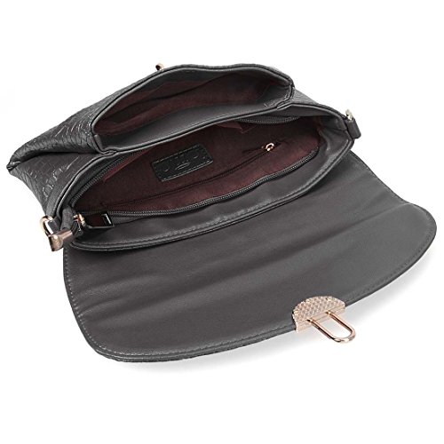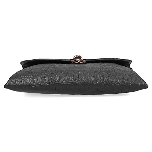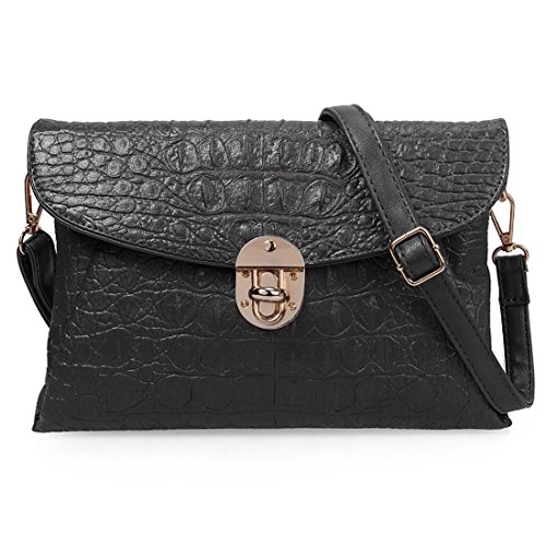 BMC Womens Charcoal Black Faux Crocodile Skin Textured PU Leather Envelope Flap Fashion Clutch Handbag