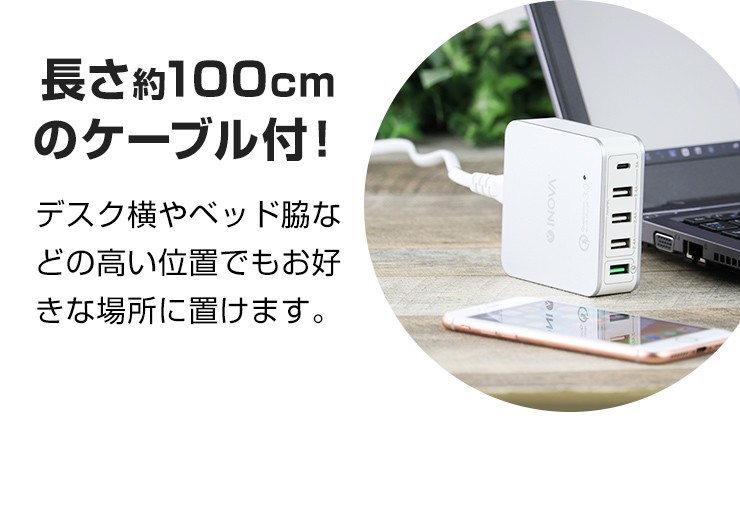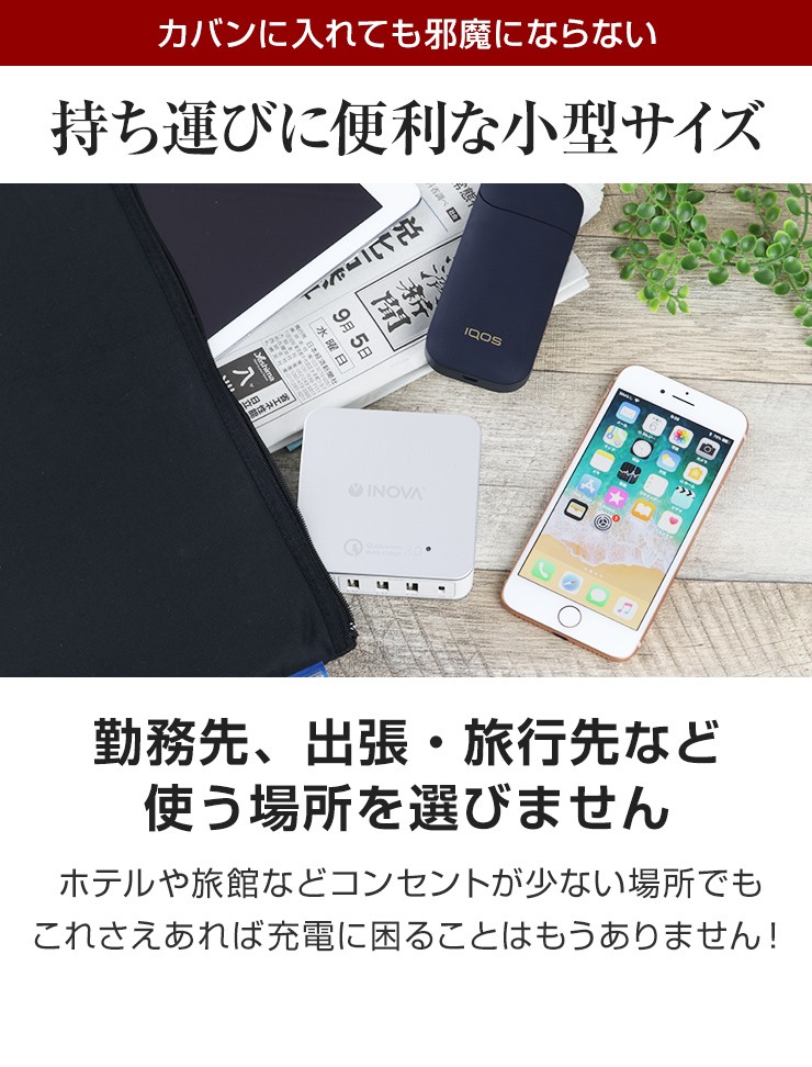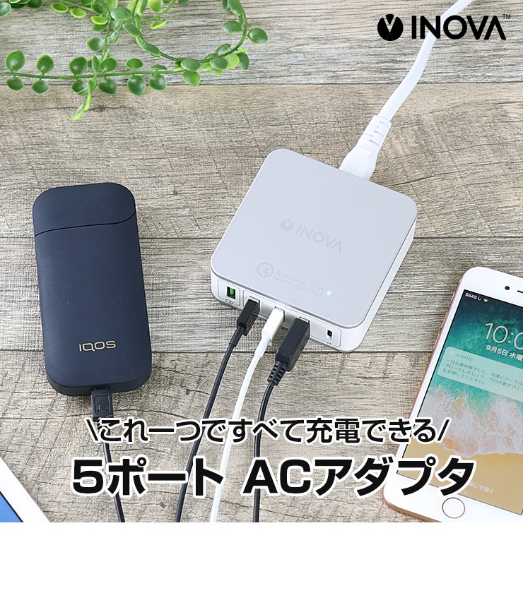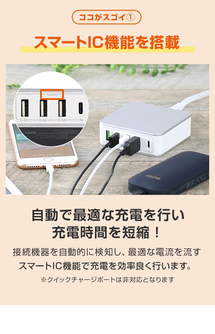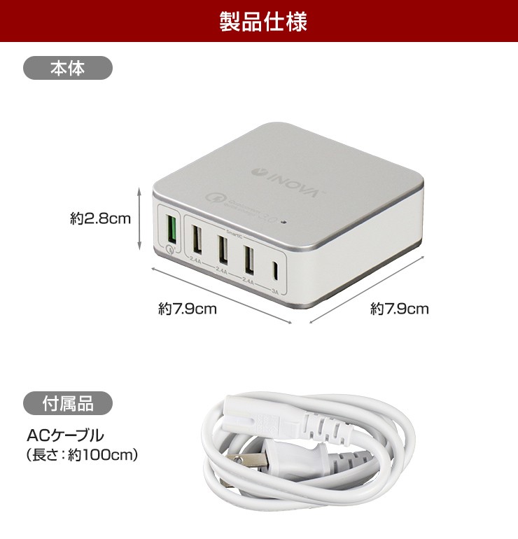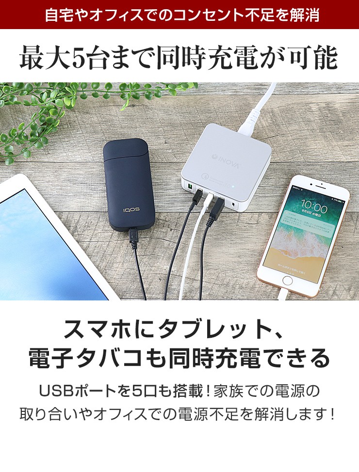 スマホもタブレットも電子タバコも!これ一つですべて充電できる、5ポート搭載のUSB ACアダプタが登場!さらに!Type-C&クイックチャージポート付き!●スマートIC機能が自動で最適な充電を行い、充電時間を短縮します!●Type-Cポート付きで最新スマホをお使いの方にも便利!●クイックチャージポート付きで、充電時間が劇的に短縮できます!●入力電圧100-240Vで海外での利用も可能!(コンセント形状が同じ場合に限ります)※その他の形状は海外変換アダプタ等が必要になります。●安心の国内電気用品安全法認証済!品質保証のPSEマーク! 製品仕様 入力:AC100-240V 1A出力1:USB:5V 2.4A(MAX)×3出力2:Type-C:5V 3A出力3:QC3.0:3.6-6.5V 3A、6.5-9V 2A、9-12V 1.5A(18W MAX)TOTAL:40W周波数:50/60Hzサイズ:約79×79×28mm重量:約181g付属品:ACケーブル×1(長さ:約1000mm)お買い上げから6ヵ月間保証デジキン