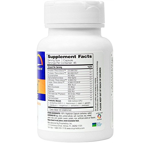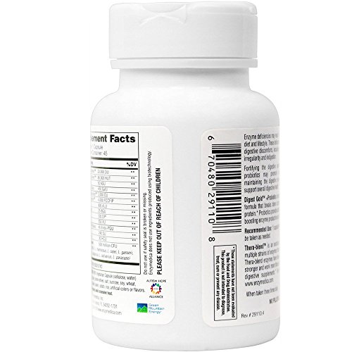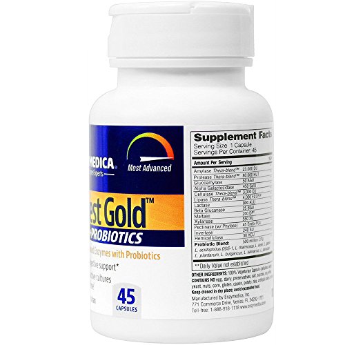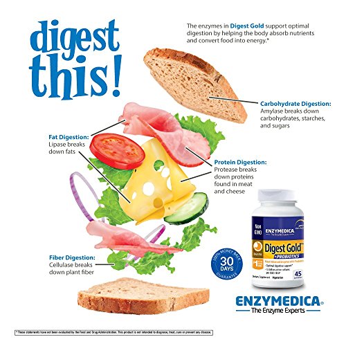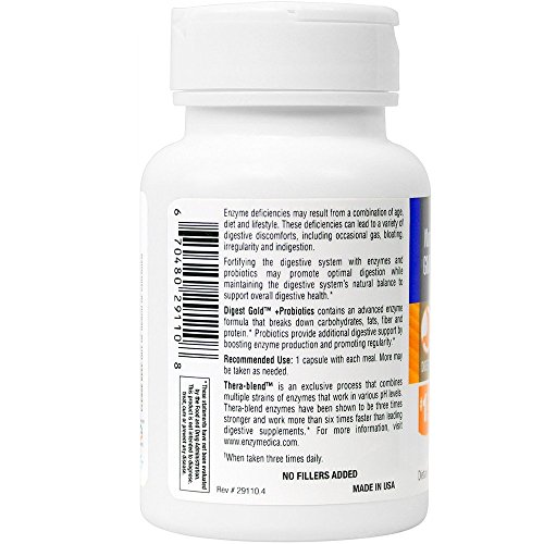 -. Binding : Health and Beauty -. Brand : Enzymedica -. Feature : YOU'RE MISSING SOMETHING: Enzymes are key players in the digestive process. They help maximize nutrient extraction, turning consumed food into energy. Aging depletes the amount of enzymes available for use in the body, and when foods are cooked or processed, the enzymes contained in the food are destroyed, requiring the body to use its own enzymes to break down foods. These deficiencies can lead to a variety of digestive discomforts, including gas, bloating, indigestion and irregularity. / PROBIOTICS TO THE RESCUE: Supplementing with enzyme products like Digest Gold + Probiotics can aid in the digestive process. Probiotics supplement the beneficial flora that reside in the digestive tract. These organisms support regularity, aid the immune system, produce essential vitamins like B and K, and fuel digestion through their production of enzymes such as lactase, protease and amylase. / ADVANCED MULTI ENZYME SUPPORT: Digest Gold + Probiotics is Enzymedica's most potent enzyme formula that breaks down carbohydrates, fats, fiber and protein while providing probiotics. Probiotics offer additional digestive support by boosting enzyme production and promoting regularity. Digest Gold + Probiotics provides the convenience of high-potency digestive enzymes combined with guaranteed delivery of active probiotic cultures. / FREE OF: Rest assured knowing that this product does not contain any egg, dairy, preservatives, salt, sucrose, soy, wheat, yeast, nuts, corn, gluten, casein, potato, rice, or any artificial colors or flavors. / QUALITY + EXPERIENCE: Enzymedica was founded in 1998 with the purpose of offering our customers the highest-potency enzyme products possible. Our goal of educating people about the importance of enzymes in overall health is what motivates Enzymedica. All of our products are made from only the highest quality enzymes and contain absolutely no fillers to ensure purity. Every product is 100% vegetarian, and we seek out vegan and Kosher ingredients whenever possible. -. IsAdultProduct : 0 -. Label : Enzymedica -. Manufacturer : Enzymedica -. MPN : 29110-FFP -. PackageQuantity : 1 -. PartNumber : 29110-FFP -. ProductGroup : Health and Beauty -. ProductTypeName : HEALTH_PERSONAL_CARE -. Publisher : Enzymedica -. Size : 45 -. Studio : Enzymedica -. Title : Enzymedica - Digest Gold + Probiotics, Advanced Digestive Enzymes + Probiotics for Essential Digest Care, 45 Capsules (FFP)