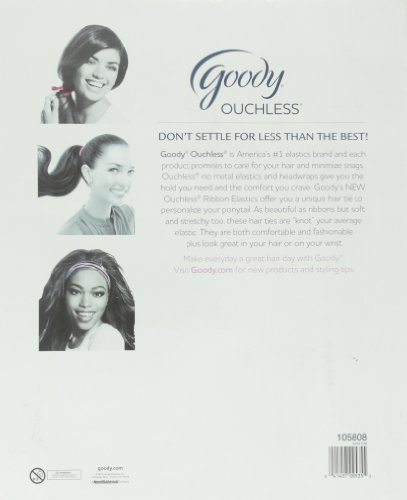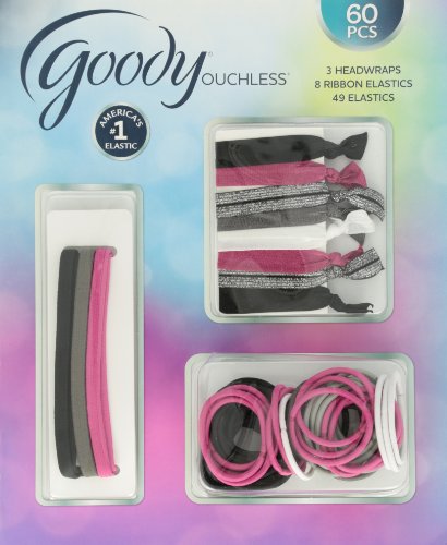 - Feature : Ouchless no metal elastics include basic black, pink, grey and white colors for your every style / Ouchless ribbon elastics feature a unique knot style hair tie and soft stretchy ribbon material that looks beautiful in the hair or on the wrist / Ouchless head wraps care for your hair with a gentle and comfortable hold while reducing snags and breakage / From America's No.1 elastics brand, goody ouchless / Includes 3 head wraps, 8 ribbon elastics and 49 elastics in a cherry blossom color assortment