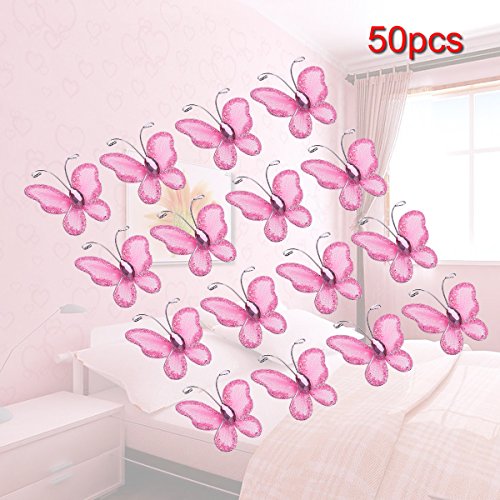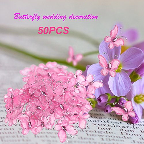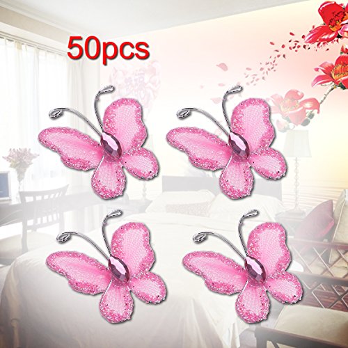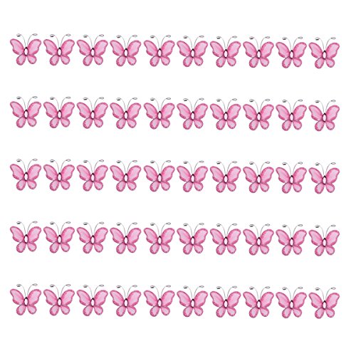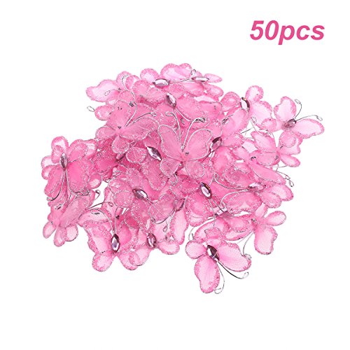 Tinksky 50pcs Sheer Mesh Wire Glitter Butterfly with Gem,Sew on Wedding Dresses Wedding Favors (Pink)