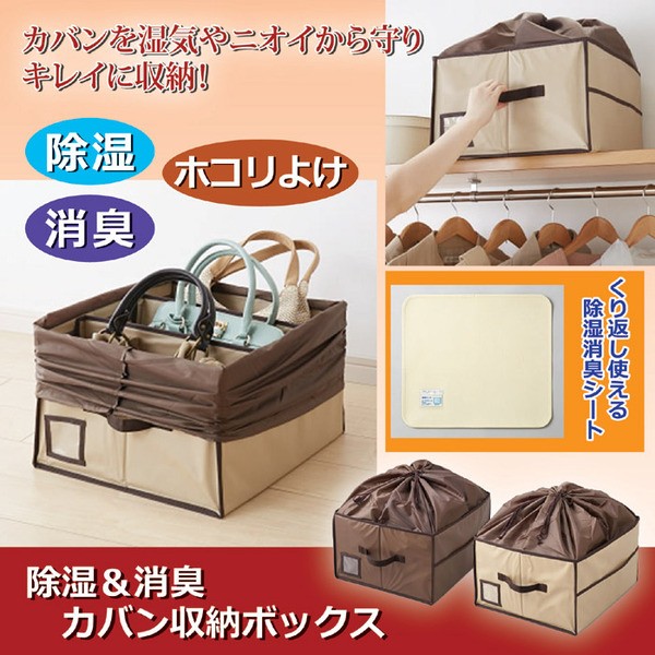 【商品名】 バッグ(鞄)収納ボックス 除湿&消臭マット/仕切り板2枚/フタ付き ブラウン 【ジャンル・特徴】 カバンを湿気や臭いから守り便利に収納できる蓋付き収納ケース ■サイズ・色違い・関連商品■ブラウン[当ページ]■ベージュ関連商品の検索結果一覧はこちら お気に入りのバッグを大切に保管したい・・・という方にオススメの専用ボックス。布や革製の多いバッグ類は、湿気を嫌い、長期保存によってニオイも気になってきます。本製品は、収納しながら除湿と消臭機能も備わった保管用です。通気性も確保しながらホコリをしっかりと防ぐことができます。バッグ類の持ち手部分が大きいものでも、フタ部分が巾着タイプになっているので心配ありません。中身がわかるネームポケットや取り出しやすい持ち手、両サイドに保証書などを入れることができるポケットなど、使い勝手もバツグン。■商品スペック【商品名】除湿&消臭カバン収納ボックス ブラウン 【サイズ】約幅40×奥行45×高さ25cm 【重量】約1kg 【材質】ポリプロピレン不織布、ポリプロピレンフィルム、ポリエステル、B型シリカゲル 【付属品】除湿&消臭マット1枚、仕切り板2