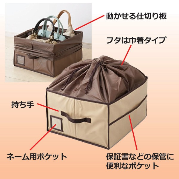 お気に入りのバッグを大切に保管したい・・・という方にオススメの専用ボックス。布や革製の多いバッグ類は、湿気を嫌い、長期保存によってニオイも気になってきます。本製品は、収納しながら除湿と消臭機能も備わった保管用です。通気性も確保しながらホコリをしっかりと防ぐことができます。バッグ類の持ち手部分が大きいものでも、フタ部分が巾着タイプになっているので心配ありません。中身がわかるネームポケットや取り出しやすい持ち手、両サイドに保証書などを入れることができるポケットなど、使い勝手もバツグン。