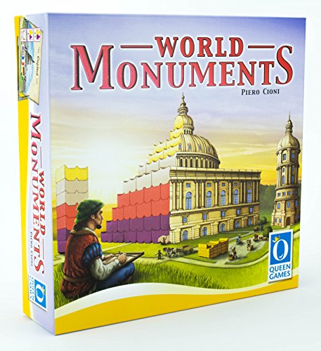 Studio : Queen Games Direct Import Publisher : Queen Games Direct Import Binding : Toy Product Description World Monuments is a game by Piero Cioni. In World Monuments the players take the role of master builders and construct monumental buildings of historic significance. In each game the players choose one of four buildings and start constructing it from the ground up: The Capitol in Washington, the cathedral Notre Dame in Paris, the St. Peters basilica in Rome or the mausoleum Taj Mahal in Agra. Only the most talented master builder among the players will gain many points and have a chance of winning the game, after the building is completed. 0