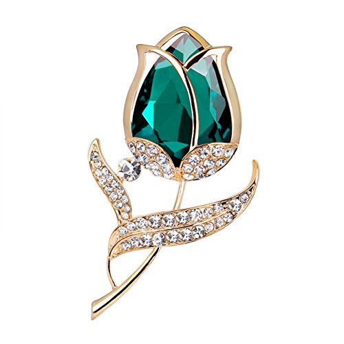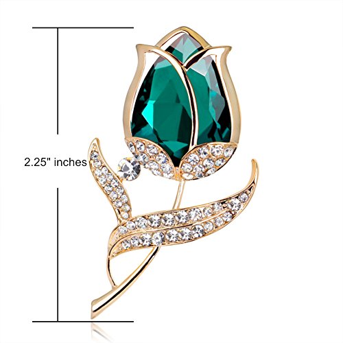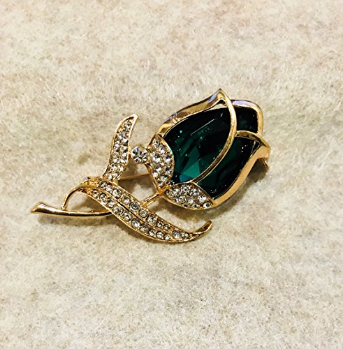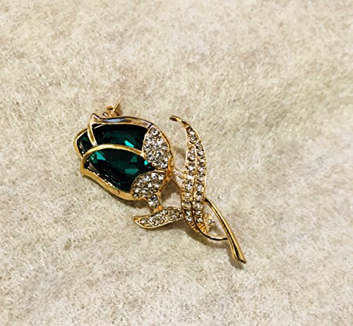 Romantic Rose Flower Gold Plated Crystal Rhinestone Charms Brooch Pin for Women (Green)