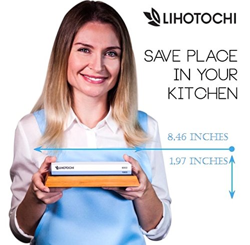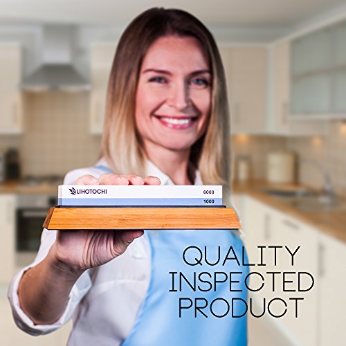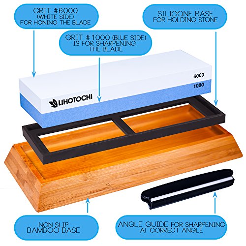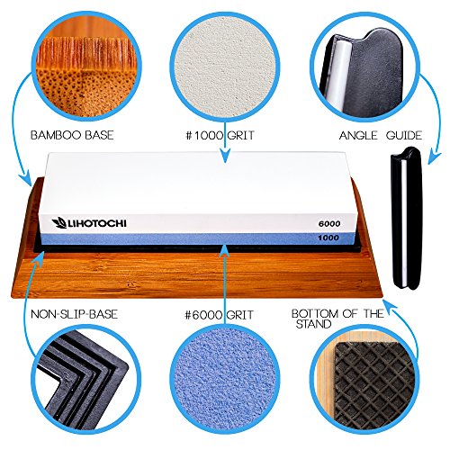Lihotochi - Best Waterstone - Sharpening stone for knives - 2 sided whetstone flattener set - Universal kit 1000/6000 grit with NonSlip Bamboo Base & Angle Guide