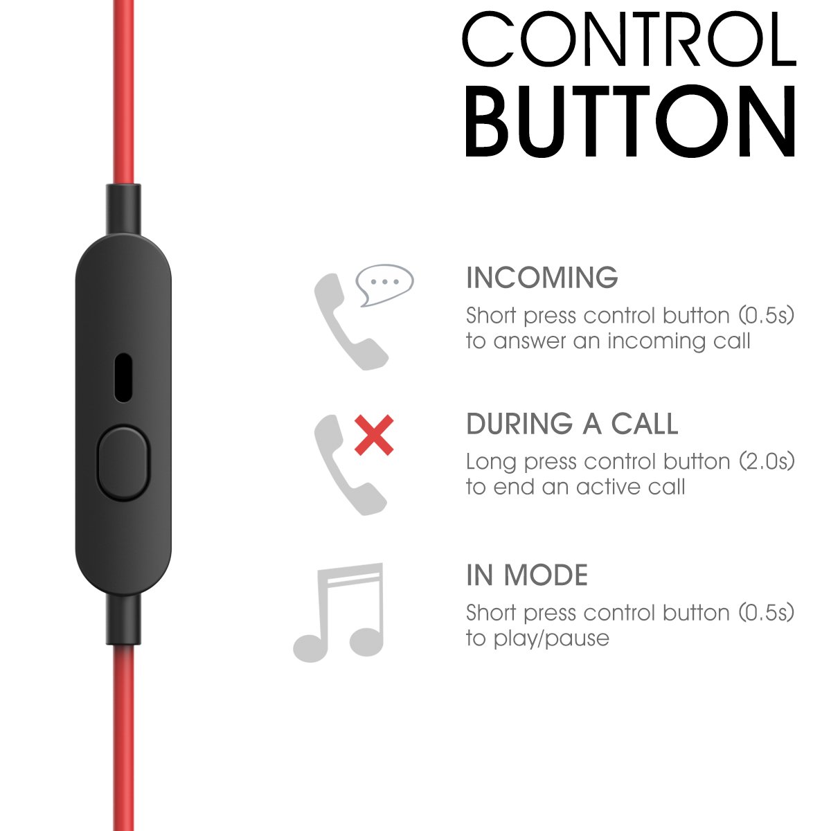 In mode: Play / pause when you push the control button briefly (0.5 s).