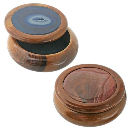 - Beautifully turned wood boxes feature an agate slab inlaid into the lid