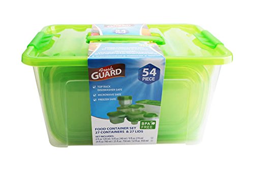 Plastic Food Container Set by Fresh Guard~54 pieces | 27 Clear Containers & 27 Neon Green Lids
