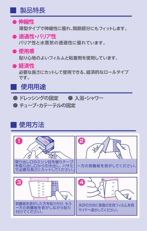 肌にやさしい防水フィルムドレッシングです。フィルムの厚さは、約15μmの薄型タイプで、伸縮性に優れ、関節部分にもフィットします。バリア性と水蒸気の透過性に優れています。貼り心地のよいフィルムと接着剤を使用しています。必要な長さにカットして使用できる、経済的なロールタイプです。未滅菌・ラテックスフリー。 |