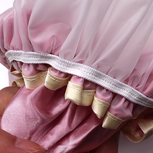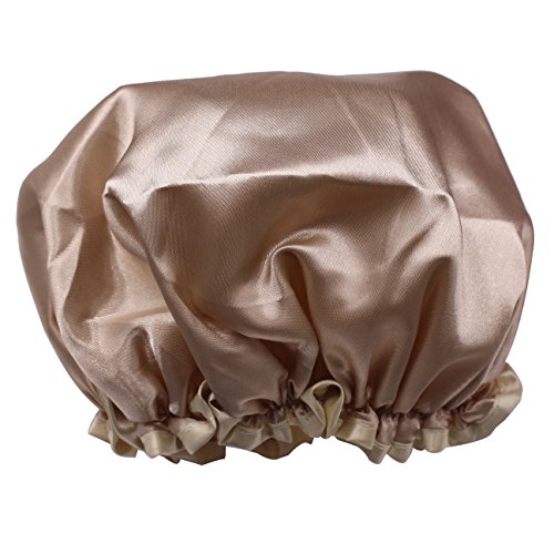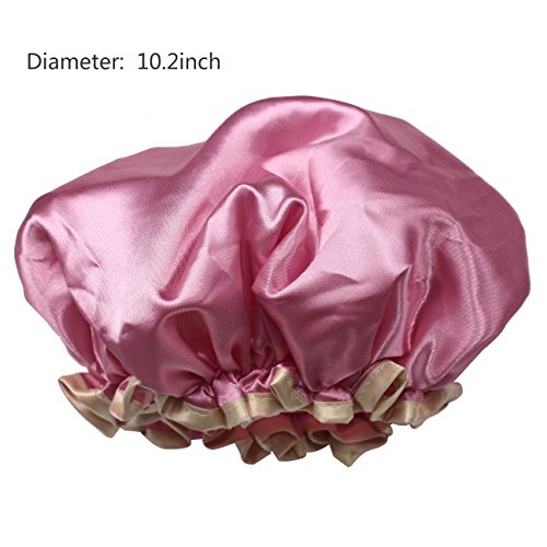 This product is made of double-layer material; waterproof PE inner layer, to protect the hair is not wet; light satin outer layer, silky breathable, easy to wash quick; special Oxford elastic mouth, wear comfortable tight Stretching; bathing, washing, cooking can be used