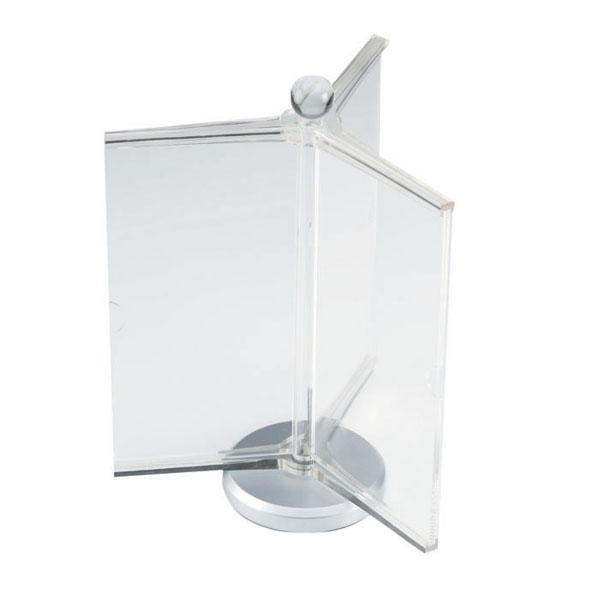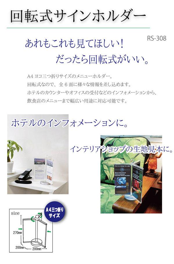 A4横3折サイズのメニューホルダーです。回転式なので、全6面にさまざまな情報を差し込めます。用紙の差し替えはサイドからの抜き差しなので、扱いも簡単! 製造国:中国 素材・材質:土台・ベース部:アクリル、パネル部:ポリスチレン、シリンダー部:金属 商品サイズ:W200×D200×H270mm 重量:510g 仕様:用紙サイズ:W102×H214(A4・3折) ※サプライヤー直送品 ご注文後2~3営業日後の出荷となります【商品名】回転式 サインホルダー RS-308