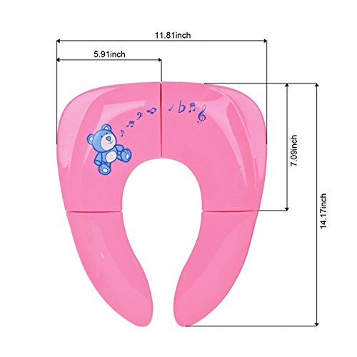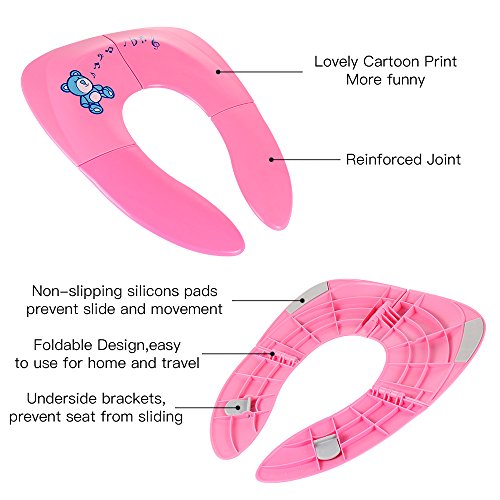 Tinabless baby travel potty seat help you to solve these problems. Sanitary : Mother's or child's hands never need to touch the toilet bowl, guaranteeing safety and hygiene. Portable : Folds compactly for storage into included travel bag. Stable: This Travel Toilet Potty provides 2 pieces of non-slipping rubber pads and locks to ensure mechanism stability, then secure children. Comfortable : The contoured curves also make it comfortable and easy for toddlers to get on and off the toilet by themselves, helping them become independence. Easy to clean: Our folding potty seat is easily cleaned with warm soapy water. Note: The portable potty seat may slip when kids move, so please keep an eye on your baby when sitting on it.