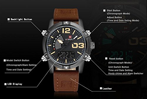 -. Feature : [フェイス]   直径 4.5 cm / [Brand]  NAVIFORCE / [バンド] 長さ  25.0 cm / 幅   2.4 .cm / レザーバンド / [機能]    ストップウォッチ / アラーム / 3気圧防水 / 曜日表示 / デジタルクロノグラフ