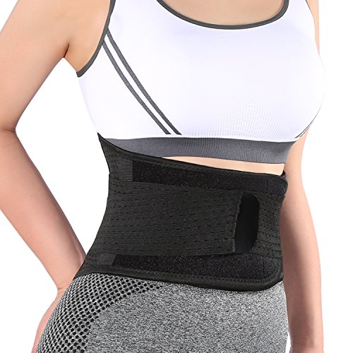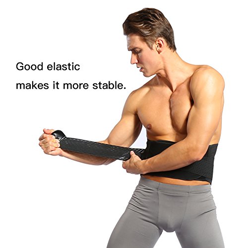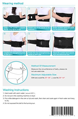 -. Feature : 9 inch wide back area support with 4 steel stabilizers, provides good support along the lower back and lumbar area / Two Size for option, S/M size suits for belly size 25"- 32", L size suits for belly size 32"- 44". Please measure the size around belly not waist. If you are around 32", please go the L size / Helps relieve lower back pain from strains, sprains and muscle spasms, protect your back from lifting, golfing and other activities, keep back straight and correct siting posture / Works well in weight listing, bending, workout, houseworking, yoga, golfing, long siting office work and long distance driving / Great for long siting office workers, drivers, housewife, fitness buff, and people who suffers lower back pain or need support the back to keep the spine straight