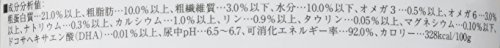 素材構成:粗蛋白質…21%以上、粗脂肪…10%以上、粗繊維質…3%以下、水分…10%以下、カルシウム…1.0%、リン…0.9%、ナトリウム…0.3%、タウリン…0.05%、ドコサヘキサン酸(DHA)…0.01%、オメガ3…0.5%以上、オメガ6…3.0%以上、尿中pH…6.5~6.7