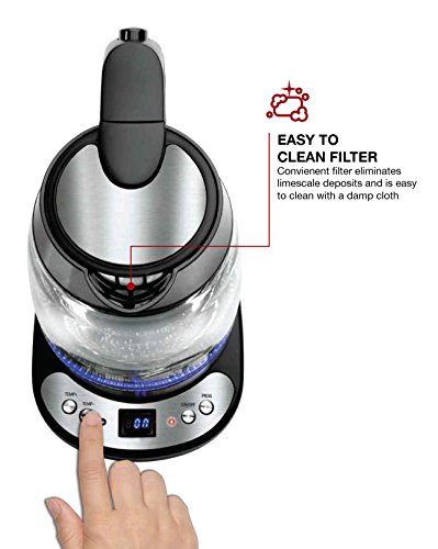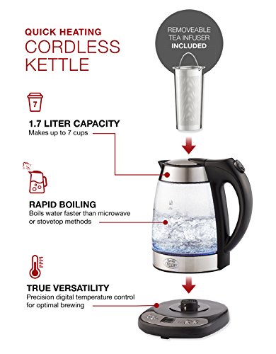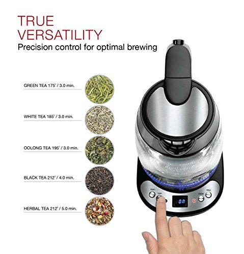 VERSATILE - great for tea, coffee, instant oatmeal and more; has an option to keep water at the desired temperature for up to 60 minutes; bonus tea infuser is included with purchase for brewing your favorite loose-leaf or bagged teas directly in the stain-resistant borosilicate glass kettle