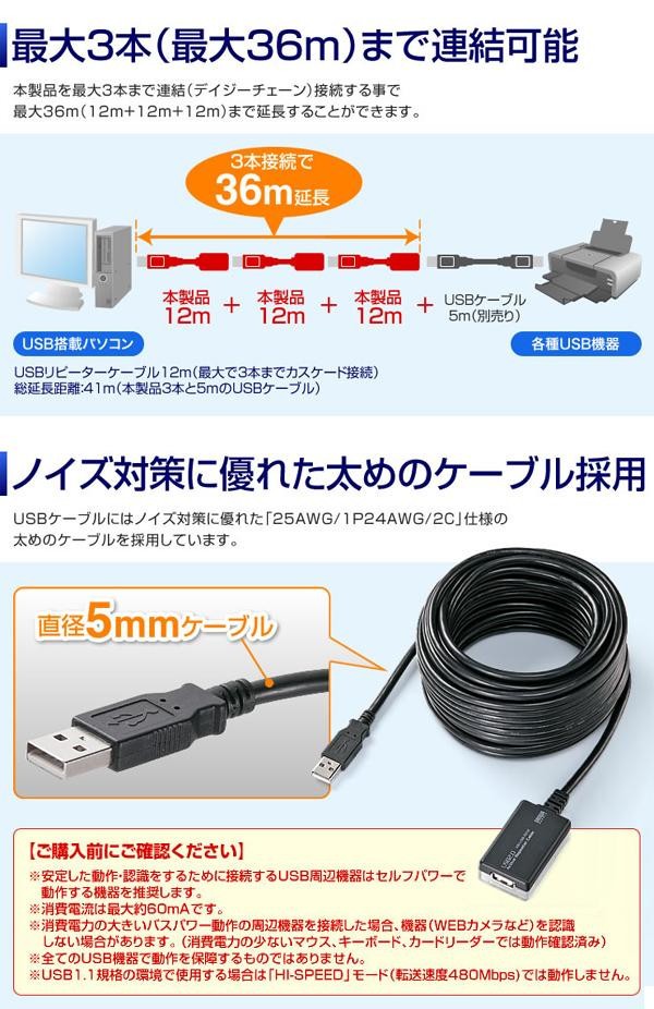 | 最大12m延長できるハイパワーUSB延長リピーターケーブル。 |