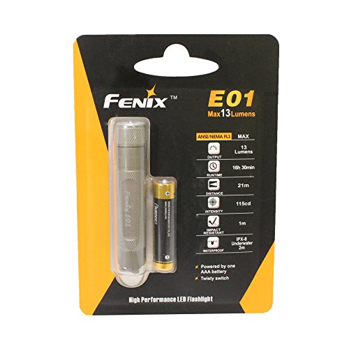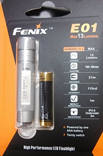 Studio : Fenix Flashlights Publisher : Fenix Flashlights Product Description The Fenix E01, a perfect portable mini LED flashlight, with negligible volume and weight, can be put into your purse, pocket or simply be fastened onto your key chain. It could serve you as your reliable companion at any time. Though it is compact in volume, the Fenix E01 has amazing performances. You will be marveled at its excellent brightness and extraordinary long runtime, high reliability durability, outstanding water resistance and its exquisite workmanship. All these make it become your best choice to add to a flashlight collection or to give as gift or to serve as your close companion.
