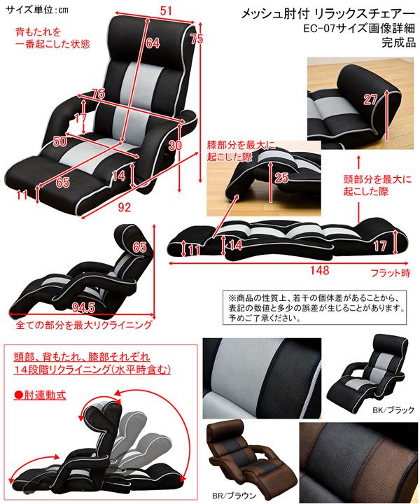 本商品はお取り寄せ商品のため、稀にご注文入れ違い等により欠品・遅延となる場合がございます。誠に恐れ入りますが、何卒ご了承ください。 また、以下の場合には追加送料がかかる場合がございます。  ・大型商品の複数購入時 ・同梱区分が異なる商品の複数購入時  【出荷目安】:1 - 4営業日 ※土日・祝除く 【同梱区分】:TS 1490 【梱包サイズ】:大型商品 【代引き決済】:不可  配送伝票の依頼主は出荷元(メーカーもしくは仕入元)名となる場合がございますので、お受け取りの際はご注意ください。   【型番】ec07  【商品名の色やサイズについて】 こちらは「メッシュ肘付き リラックスチェア ブラウン (BR)」の商品ページです。商品画像や商品情報には、色違いやサイズ違いの商品が載っている場合がございます。ご注文前に色・サイズ・セット内容のご確認をお願いいたします。  各部の細かいリクライニングで様々な姿勢にぴったりとフィットするメッシュ肘付きリラックスチェアです しっかりした厚みのあるクッション 背もたれ部分は約17cm 適度な硬さと弾力で体を優しく受け止めてくれます 肘部分にもクッション付きなのでゆったりと腕を乗せることができます 表面は通気性抜群のポリエステル100%メッシュ素材 長時間座っていても蒸れにくく表面はサラサラです 裏面はナイロン仕様 床に接する裏面部分はナイロン素材 丈夫で摩擦やカビに強く長くお使いいただけます 好みの姿勢にぴったりフィットする14段階リクライニング機能付き(水平時含む) ヘッド、肘掛け(背もたれと連動)、膝、背もたれ、それぞれ14段階のリクライニングができます 細かく調節ができるので自分に合ったピッタリの角度をお探し下さい ヘッド部分の角度を調整するとヘッドレストのようになりテレビ視聴や読書に最適な姿勢を保てます 肘掛け部分は背もたれの動きと連動して稼動します ブラックとブラウンよりお選び下さい  幅750×奥行920~1480×高さ170~750mm(梱包サイズ:幅1480×奥行750×高さ200mm) 本体重量:9.0kg(梱包重量:11.0kg) 完成品(1梱包) フレーム:スチールパイプ 張り材:(表)ポリエステル100%メッシュ、(裏)ナイロン 中材:ウレタンフォーム 原産国:中国  【ご注意事項】 ※本商品は、北海道・沖縄・離島への配送はいたしかねます。あらかじめご了承ください。