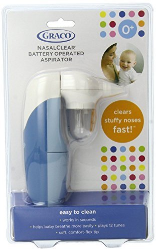 -. Binding : Baby Product -. Brand : Graco -. EAN : 0802711627398 -. Feature : 12 different children's tunes while in use, help divert your child and comfort her while clearing her nasal passages / Battery operation lets you control the suction you maintain the suction or release it as needed / Soft, flexible silicone tips make it gentle and comfortable to use even on a newborn baby / Silicone tip for different nostril shapes and different types of congestion / Clear plastic collection cup helps you evaluate your baby's level of congestion -. Label : Graco -. Manufacturer : Graco -. ProductGroup : Baby Product -. ProductTypeName : BABY_PRODUCT -. Publisher : Graco -. Studio : Graco -. Title : Graco Newborn Baby Nasalclear Nostril Suction Nasal Aspirator Soft, Flexible -. UPC : 802711627398