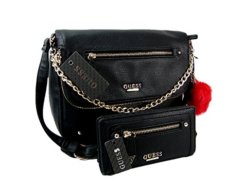 2 Piece Set = 1 Purse and 1 Wallet Description: Black exterior with gold hardware. Front flap closure. Front zipper pocket and an additional zipper pocket. Heart hangtag. The interior is fully lined and contains a zipper pocket and 2 slip pockets. Measures approximately 10 inches across by 9 inches high. Chain style top handle with a drop of 3 1/2. Adjustable shoulder strap. Tag Information: Style: 17GF-152 Name: Rosalee Color: Black Matching Wallet: It measures 6 3/4 inches by approximately 3 3/4 inches. The interior contains 12 credit card slots, an ID window and 4 larger slip pockets. Additional front zipper pocket. Tag Information: Style No.: 17GF-167 Name: Rosalee Color: BlackFeature