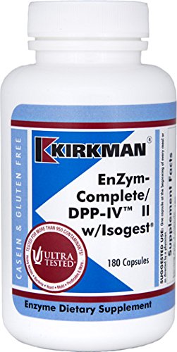 A broad spectrum enzyme with isomaltase/palatinase activity. Free of common allergens. Gluten and casein free. Capsules are plant based. Ultra Tested®. EnZym-Complete/DPP-IVTM II with Isogest® is Kirkman's most popular enzyme. This proprietary enzyme is formulated to support digestive activity for a full range of foods. The addition of the dipeptidyl peptidase-IV (DPP-IV) enzyme analog supports the ability of the body to degrade peptides formed from exposure to casein and gluten. Kirkman's proprietary enzyme Isogest® is also included for more complete digestion of carbohydrates. This product includes a unique blend of 18 pure, plant-based enzymes that are recognized as essential for the effective digestion of all food groups, including proteins, carbohydrates, fats, sugars and fiber under a wide range of pH conditions. Kirkman's EnZym-Complete/DPP-IVTM products provide a combination of proteases, amylases, lipases, disaccharides and cellulases that replace the enzymes lost in cooking, thus lessening the burden on the body's digestive tract so that it can function optimally, while also supporting optimal nutrient absorption.Feature