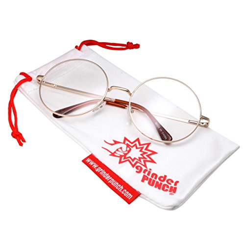 grinderPUNCH Non-Prescription Round Circle Frame Clear Lens Glasses. Choose from 3 different sizes - small, medium and large. Round Circle thin metal frame with clear, non prescription lens. UV400 Protection.