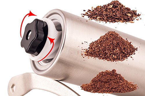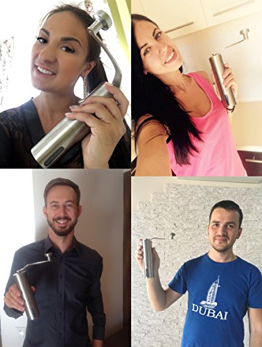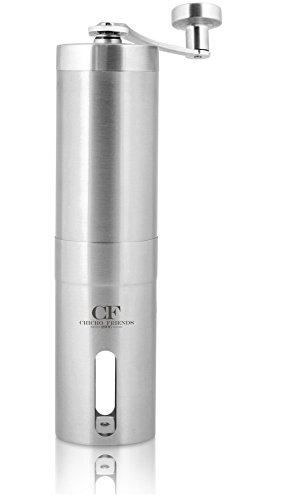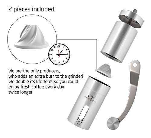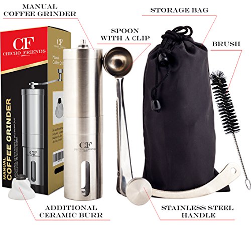 -. Feature : PORTABLE, NO NEED POWER PLUG: No need to plug it into the power socket to use, as our coffee grinder manual is very silent - it will not wake your relatives up while you grind the tasty coffee in the morning. Aeropress, pour over, Chemex, coffee pot, espresso, Turkish coffee, French press - all these option are easily available with our stylish product from stainless steel. / ADDITIONAL BURR GIVES THE DOUBLE LIFE: thanks to additional ceramic burr included, we are the only seller who doubles the life of the coffee grinder. Burr is the main thing, on fine work of which depends the life term of the whole device. We double-life it for no additional P.R.Ice for you! Buying one adjustable coffee grinder from us, you receive two in fact! The kit also includes measuring spoon with clip, cleaning brush and a super-stylish storage bag. / ADJUSTABLE TO YOUR WISH: sturdy ceramic burr grinder will smash the coffee beans to any consistency due to its adjustability, which is simplest and precise, just as you want it. Turning the screw-nut holding the burr grinder coffee, you can set the desired grind level. It will help not only with coffee, but with various spices like pepper, laurel, as well as with tea and herbs. All-in-one in this manual burr grinder allows you to have only 1 burr grinder manual for all occasions. / ONLY SOLID METAL IN THE BODY: stainless steel is the solution for the longest life term. In addition to extra manual coffee burr grinder, our coffee grinder ceramic, unlike products from other providers, has the stainless steel on the entire surface: crank, holder and the body made of this noble metal. This will look gorgeous through years and generations! / MONEY BACK: Dissatisfied? We will give your money back or replace your manual coffee grinder! What our customers say of Chicho Friends Grinder: "The better grinder than the electric one"; "Mills fine for espresso and in many other options you want"; "French press and several other brewing types are totally accessible with it"; "The best flawless grinder ever"; "Definitely would recommend".