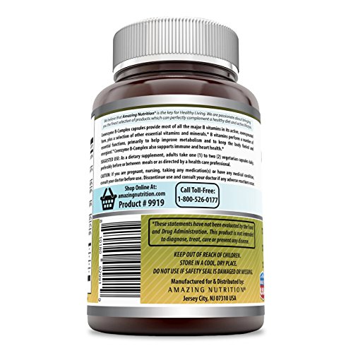 -. Binding : Health and Beauty -. Brand : Amazing Nutrition -. EAN : 0810180029919 -. Feature : SUPPORT FOR OVERALL HEALTH - B vitamins are needed for many bodily functions from metabolizing food to producing energy to keeping the heart and nervous system healthy / ALL NATURAL COMPLETE B COMPLEX You get all the essential B vitamins with our easy-to-take vitamin B Vegetarian Capsules, simplifying good nutrition. Our complex B vitamin is free of artificial preservatives, flavors, dyes and sweeteners. / BALANCED BLEND Our B complex formulation gives you a balanced dosage of the 11 key nutrients in a form that is easy for the body to absorb. / QUALITY YOU CAN TRUST All Amazing Formulas products are manufactured in accordance with Good Manufacturing Practices (GMP), among the highest standards in the world. / PURITY & POTENCY All our products are proudly made in USA with Guaranteed Purity & Potency. We offer best quality products for the best value. All our products are Third Party Tested. We do not compromise on quality. -. IsAdultProduct : 0 -. Label : Amazing Nutrition -. Manufacturer : Amazing Nutrition -. MPN : 9919 -. PackageQuantity : 1 -. PartNumber : 9919 -. ProductGroup : Health and Beauty -. ProductTypeName : HEALTH_PERSONAL_CARE -. Publisher : Amazing Nutrition -. Studio : Amazing Nutrition -. Title : Amazing Formulas Coenzyme B-Complex - 120 Vegetarian Capsules - Supports Heart & Nervous System - Boosts Energy - Supports Overall Health & Well-being -. UPC : 810180029919