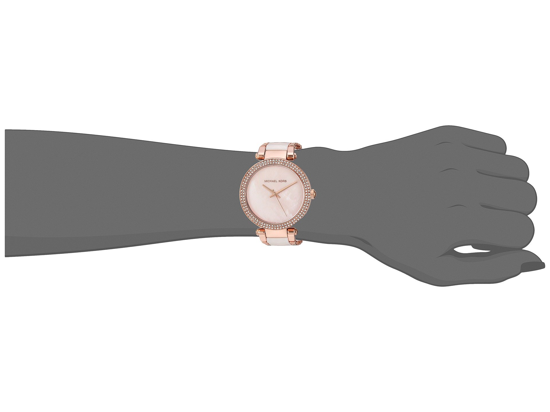 | Product Information SKU: #8776204Lend luxury to any ensemble with the gorgeous Michael Kors? Parker watch! Stainless steel case.Stainless steel bracelet with faceted acetate detailing and fold-over, double push-button closure.Round face.Three-hand analog display with quartz movement.Mother of Pearl dial features gold-tone hands and Michael Kors detailing.Crystal-embellished bezel.Water resistant 10 ATM.Display case included.Imported.This product may have a manufacturer's warranty. Please visit the manufacturer's website or contact us at warranty@support.zappos.com for full manufacturer warranty details.Measurements: Case Height: 39 mm Case Width: 39 mm Case Depth: 12 mm Band Width: 18 6?11 mm Band Circumference/Length: 8 3?4 in Weight: 3.2 oz |