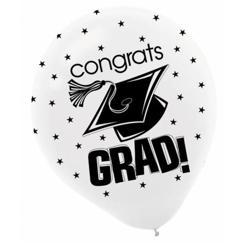 - These white balloons feature images of graduation caps, star patterns and a "Congrats Grad" headline in bold black text.