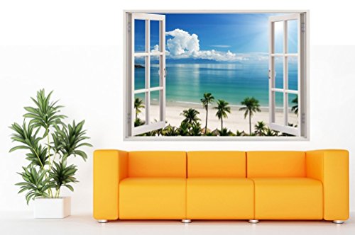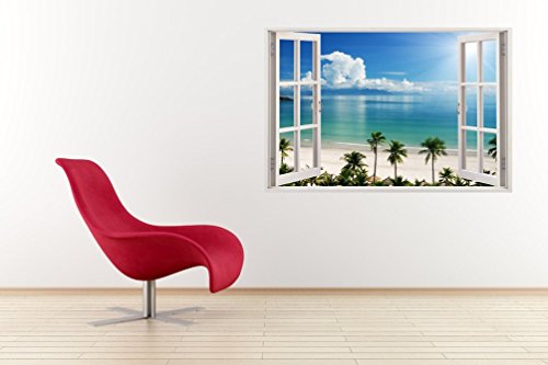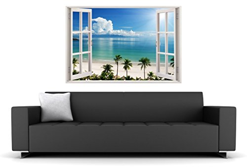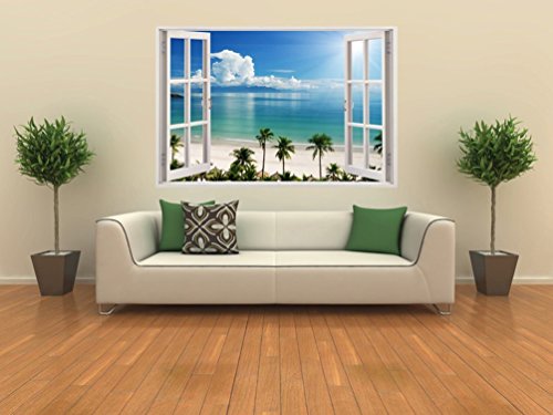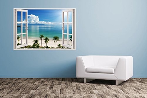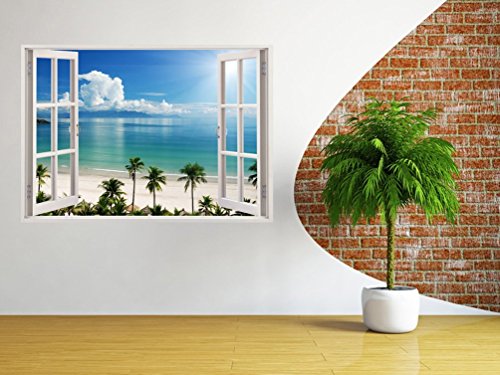 3D Depth Illusion Vinyl Wall Decal Sticker, Window Frame Style Home Décor Art Removable Wall Sticker, 85 X 115 CM (Flat Water Palm Trees Ocean Beach Sea Seascape View)