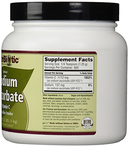 -. Binding : Health and Beauty -. Brand : Nutribiotic -. EAN : 0728177004521 -. Feature : Vitamin C has several beneficial purposes including developing and maintaining healthy skin and bones, and plays important roes in many biochemical reactions / Manufactured by dissolving pharmaceutical grade ascorbic acid with sodium hydrogen carbonate / Sodium helps regulate the amount of water in the body. It also aids the movement of sodium into and out of cells, which plays a critical role in many bodily functions -. IsAdultProduct : 0 -. Label : Nutribiotic -. LegalDisclaimer : These statements have not been evaluated by the Food & Drug Administration. This products is not intended to diagnose, cure, mitigate, treat, or prevent any disease. -. Manufacturer : Nutribiotic -. MPN : 452 -. NumberOfItems : 1 -. PackageQuantity : 1 -. PartNumber : 452 -. ProductGroup : Health and Beauty -. ProductTypeName : HEALTH_PERSONAL_CARE -. PublicationDate : 2014-03-20 -. Publisher : Nutribiotic -. ReleaseDate : 2014-03-17 -. Size : 2.2 lbs -. Studio : Nutribiotic -. Title : Nutribiotic Sodium Ascorbate Powder, 2.2 Pound -. UPC : 728177004521