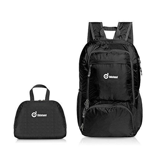 -. Title : 35L Travel Backpack, ODOLAND Packable Travel Backpack Lightweight 35L Large Handy Multiple Storage Compartments Folding Daypack Water Resistant Fabric for Outdoor Hiking (Black)