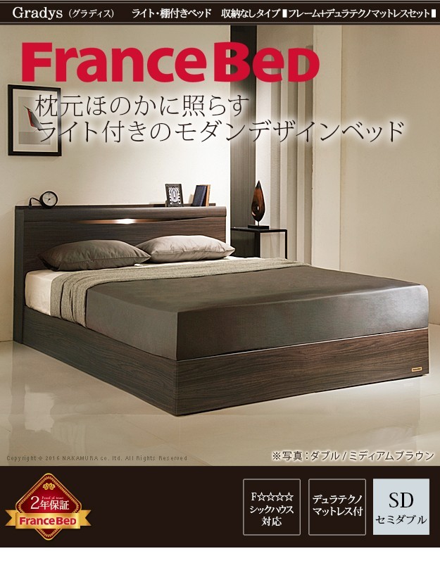 【!ご注文前に必ずご確認下さい!】●メーカー直送のため代金引換はお受けできません。●沖縄・一部離島は別途送料がかかります。お見積りいたしますのでお問い合わせ下さい。●商品サイズと設置場所、搬入経路のご確認をお願いいたします。●受注生産品のため、発注後のキャンセル及び変更はお受けできませんのでご了承ください。●安心のメーカー2年保証【セット構成】ベッドx1・マットレスx1【カラー】ダークブラウン・ミディアムブラウン・ナチュラル【仕様】■ベッド本体:プリント紙化粧合板床板:布張りコンセント:1口1500Wコード長さ:約1.7m照明:LED0.2W◎組立品■マットレス張地:ポリエステル50%、ポリプロピレン50%中身:ウレタンフォーム、パームパッド、ポリエステル綿、防虫不織布、羊毛コイル:デュラテクノスプリング【サイズ】■ベッド外寸:幅123x奥行211x高さ87cm/重量:約40.5kg床面高さ:22.5cm床面サイズ:幅123x奥行195cm宮奥行:16cm宮上有効サイズ:幅122.5x奥行12cm宮立ち上がり高さ(奥):2cm■マットレス外寸:幅122x奥行195x高さ23cm重量:約23kg株式会社ナカムラ(I-4700300)