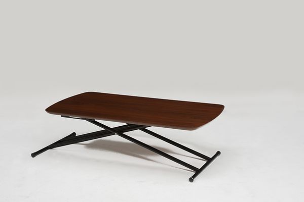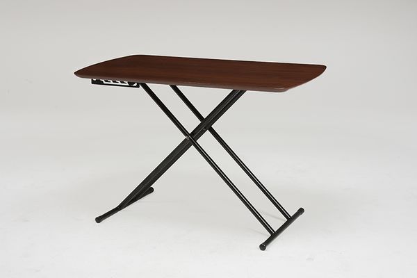 ●5段階に高さが変えられるリフティングテーブル。天然木の木目が美しい天板は素材感抜群。