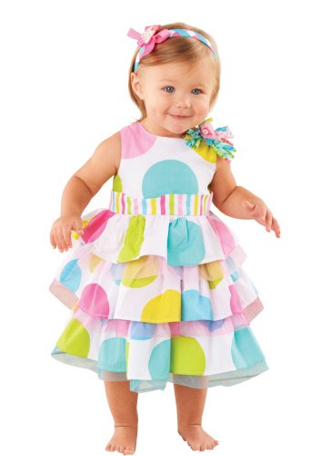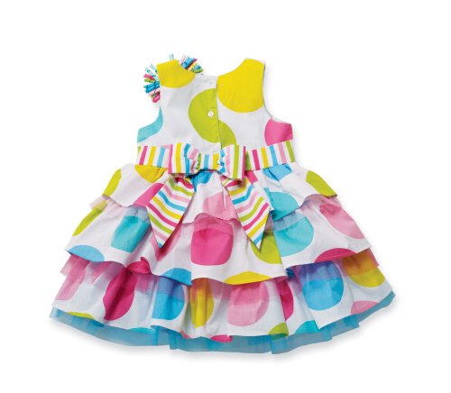 She will be the life of the party in this playful party dress has tiered skirt with chiffon layers and colorful dot pattern, adorned with curly grosgrain bow and removable felt number hair clip on number