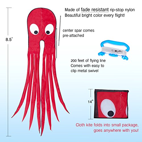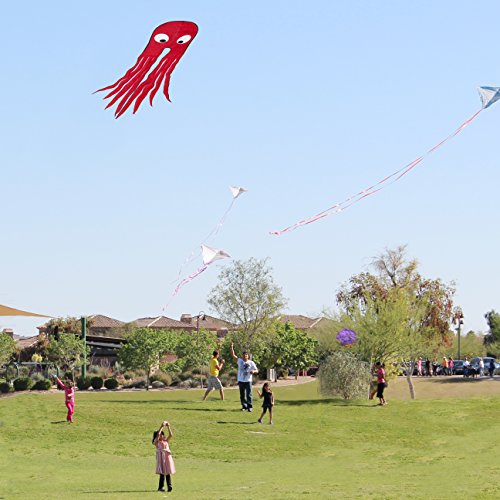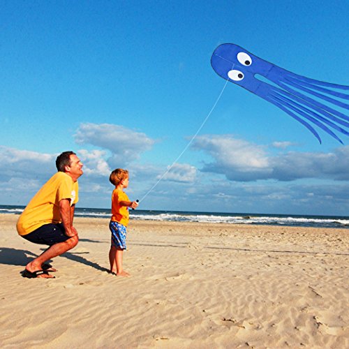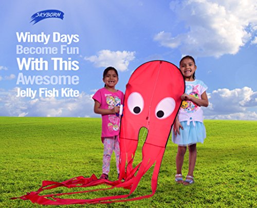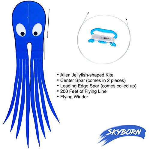 Skyborn blue giant kite with jellyfish pattern is great for all adults and children age 6 and above. Package includes a flying winder for long days in the air with less fatigue.