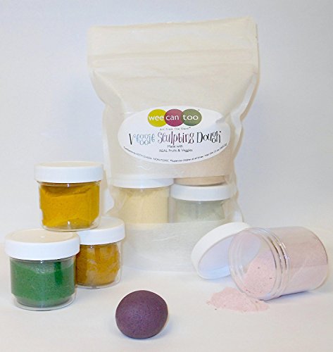 Our Veggie Sculpting Dough is turning heads, with the new concept of mixing the dough yourself! What a great fun project for little ones even before you start by having them help you add the water. No need to worry about all the chemicals, artificial dyes and lead, because our products don't have them, so it's safe for their skin and you don't need to worry about kids tasting it, because it's made from edible ingredients and contains fruits and veggies! Safe enough to eat, our Veggie Dough come in 4 colors! Purple/Blue made with REAL blueberries, Orange made with REAL pumpkins, Yellow made with REAL pumpkin and turmeric, and Green made with REAL spinach! VEGAN, no dairy, no sugar and no preservatives, does contain gluten. Veggie dough powders come in 4 jars, tucked into a grab n' go convenient tote. Mix with a very small amount of water after purchase and follow instructions on the back. To be safe, refrigerate up to two months in refrigerator after mixing. CPSIA Compliant. Made from Organic Fruit & Vegetable powders, recommended for ages 2 and up. Contains gluten, Does not contain: Soy, Dairy. From the Manufacturer Veggie Sculpting Dough will have your little one's playing, rolling, shaping, and using their hands to create masterpieces. Our Veggie Dough helps with tactile stimulation, hand strength, dexterity, motor skills, and helps children to develop shapes and hand eye coordination. Veggie Dough can also help little ones with stress relief and be therapeutic in some situations, while allowing children to express emotions. Veggie Dough can have a calm and soothing effect when they roll in their hands. Children get to see and experience the creative process of 'making something' by helping add the water and mixing the dough. Please read the back label for the amount of water to add, and don't over add water or it will ruin the dough, start with a very small amount and go to the desired consistency.Feature
