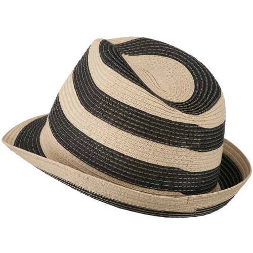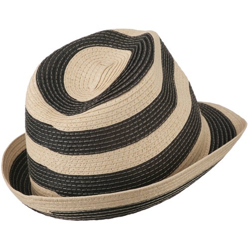 -. Binding : Apparel -. Brand : SS/Sophia -. Department : womens -. Feature : Made of 100% paper straw. / One size fits most (up to M). / Crown measures 4.5 inches deep, with stripe patterns. / Brim measures 1.75 inches wide, downturn front and upturn back. / Thin, soft and cool material. -. ProductGroup : Apparel -. ProductTypeName : HAT -. Title : Paper Braid Striped Fedora Hat - Natural Black W18S57C
