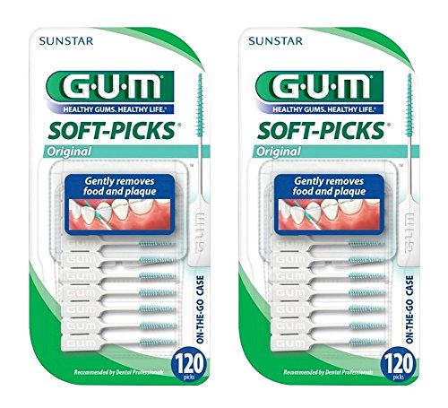 Studio : Sunstar G-U-M Publisher : Sunstar G-U-M Binding : Misc. Product Description GUM Soft-Picks?are innovative, comfortable, and easy-to-use between-teeth cleaners for the on-the-go removal of dental plaque and food particles from between the teeth and?around crowns, bridges, implants, dentures, and orthodontic appliances.?The flexible and tapered synthetic rubber bristles fit easily between most teeth, removing dental plaque where gum disease often starts and toothbrushes alone cannot reach. 0