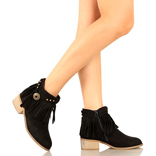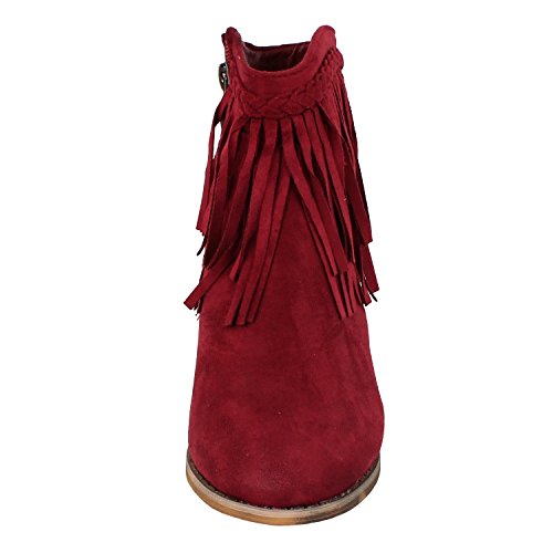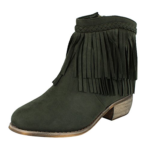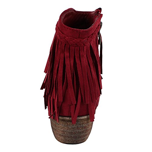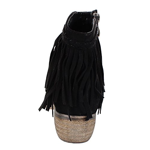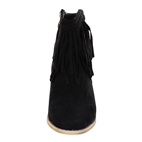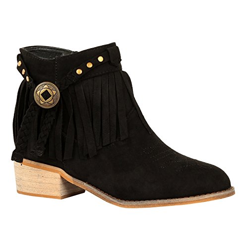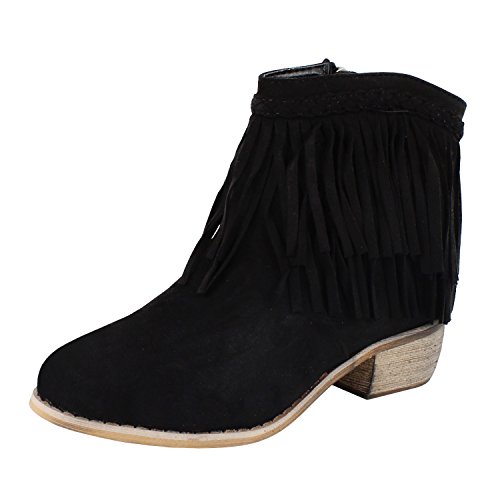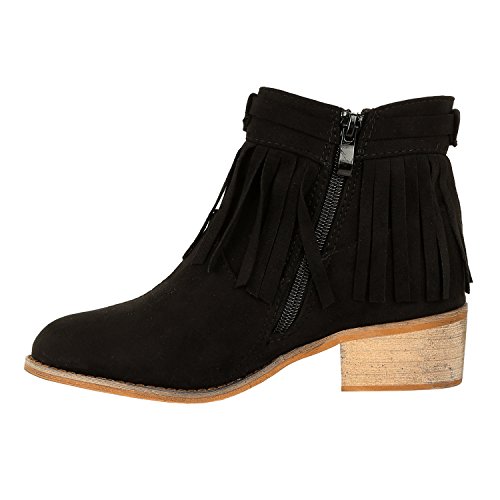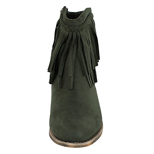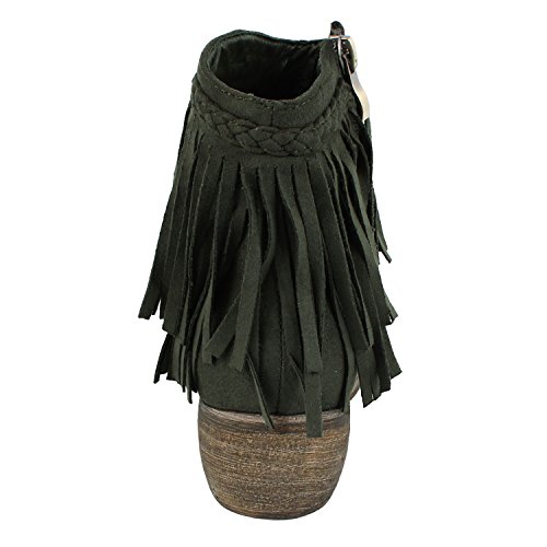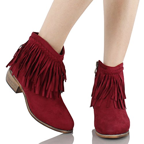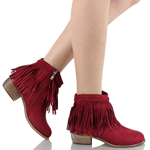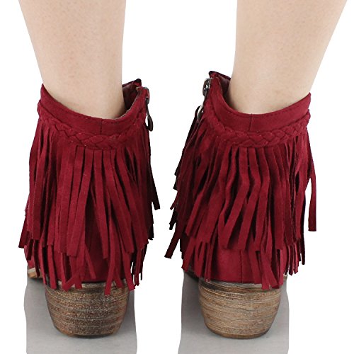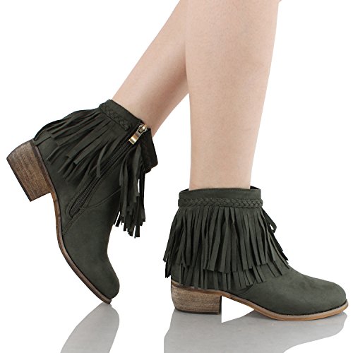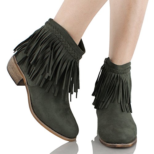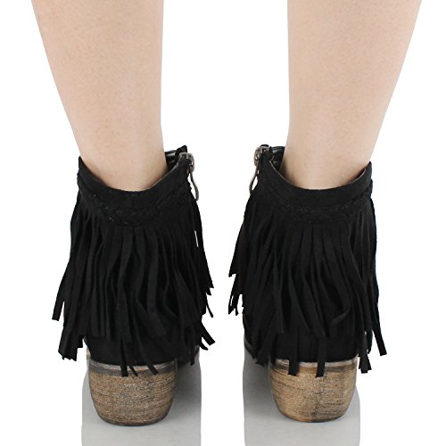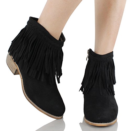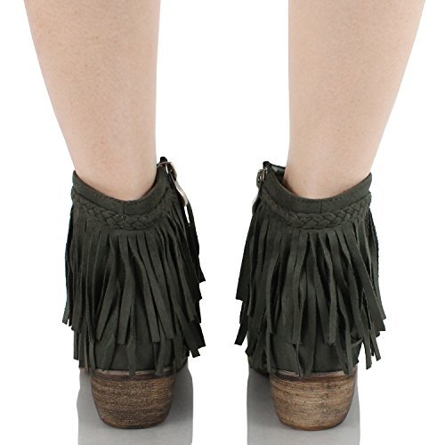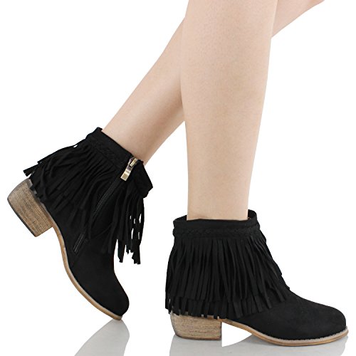 Product Description Worn for every season, these booties feature a comfortable cushioned insole that snuggles your feet to provide comfort with every step. Fringe booties work all year round! These western ankle boots have 2 layers of fringe with a wooden, block heel and suede upper. 0
