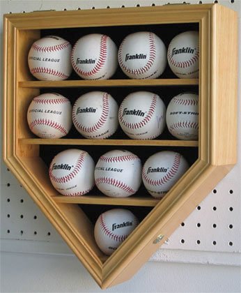 Product Description This home plate shape display case is absolutely beautiful. Home 12 MLB size baseballs. Made from hand selected hardwood. Sanded repeatedly to achieve smooth and elegant appearance. A great way to display your baseball collections. Black matted background and Hinged door cover to protect from dust and damage. Brass hinges and wall brackets to hang (Wall mounted). Indentations on shelves to secure the balls and stop them from rolling. This display case come with a lock and two keys for added protection.