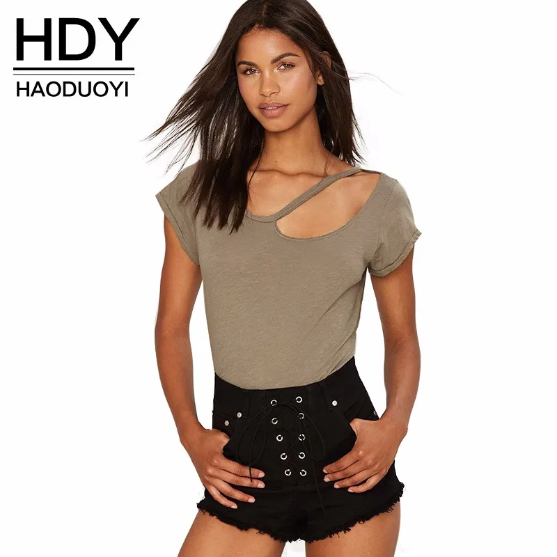 | HDY Haoduoyi Street Cut Out Slim T-shirt Crew Neck Short Sleeve Casual Tops Asymmetrical Sexy Close Fitting T-shirt | |||||||||||||||||||||||||||||||||||||||