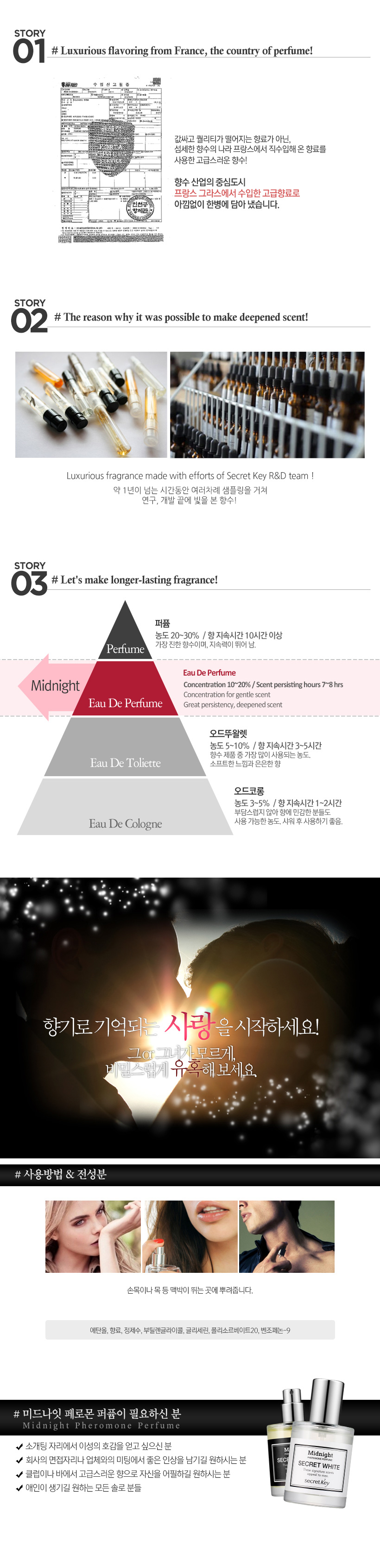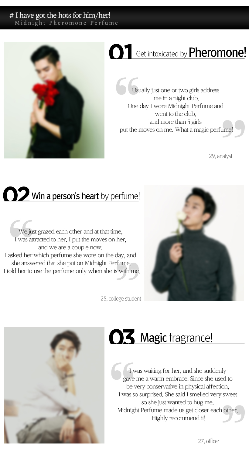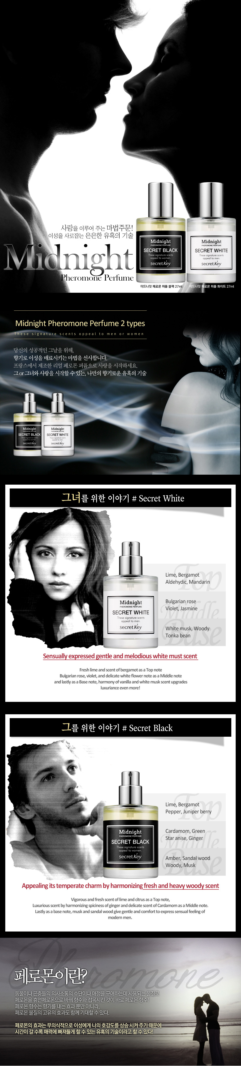 "Secret Key entered Niche Perfume Market. It released seven niche perfumes for various ambiences and circumstances: 5 Maison de Perfumes (Cosy Cotton, Pure White, Flower Garden, Sweet Heart, Glamourous) and 2 Midnight Pheromone Perfumes. Secret Key applied the best know-how such as high-quality fragrance directly imported from France, special blending method, ageing process, and manufacturing method etc. Midnight Pheromone Perfume Secret Black is a perfume for men. This fresh, citrus fragrance is exclusive to Secret Key. Midnight Pheromone Perfume Secret White, on the other hand, is for women. It has nice soft musk scent with radiant feminine notes. Both are designed to provide lasting fragrance on the skin. Secret Key said "5 Maison de Perfumes and 2 Midnight Pheromone Perfumes are high quality, cost effective product. They are great for those who rarely use perfume in their daily life."