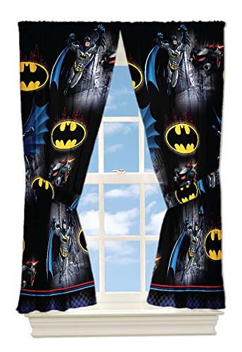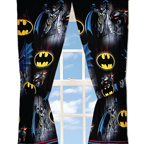 Finish off the look of your sons room with these Warner Bros. Batman safe again 82"x63" drapes. These drapes features Batman, the Bat logo and bat mobile. Made of 100% polyester microfiber.Feature